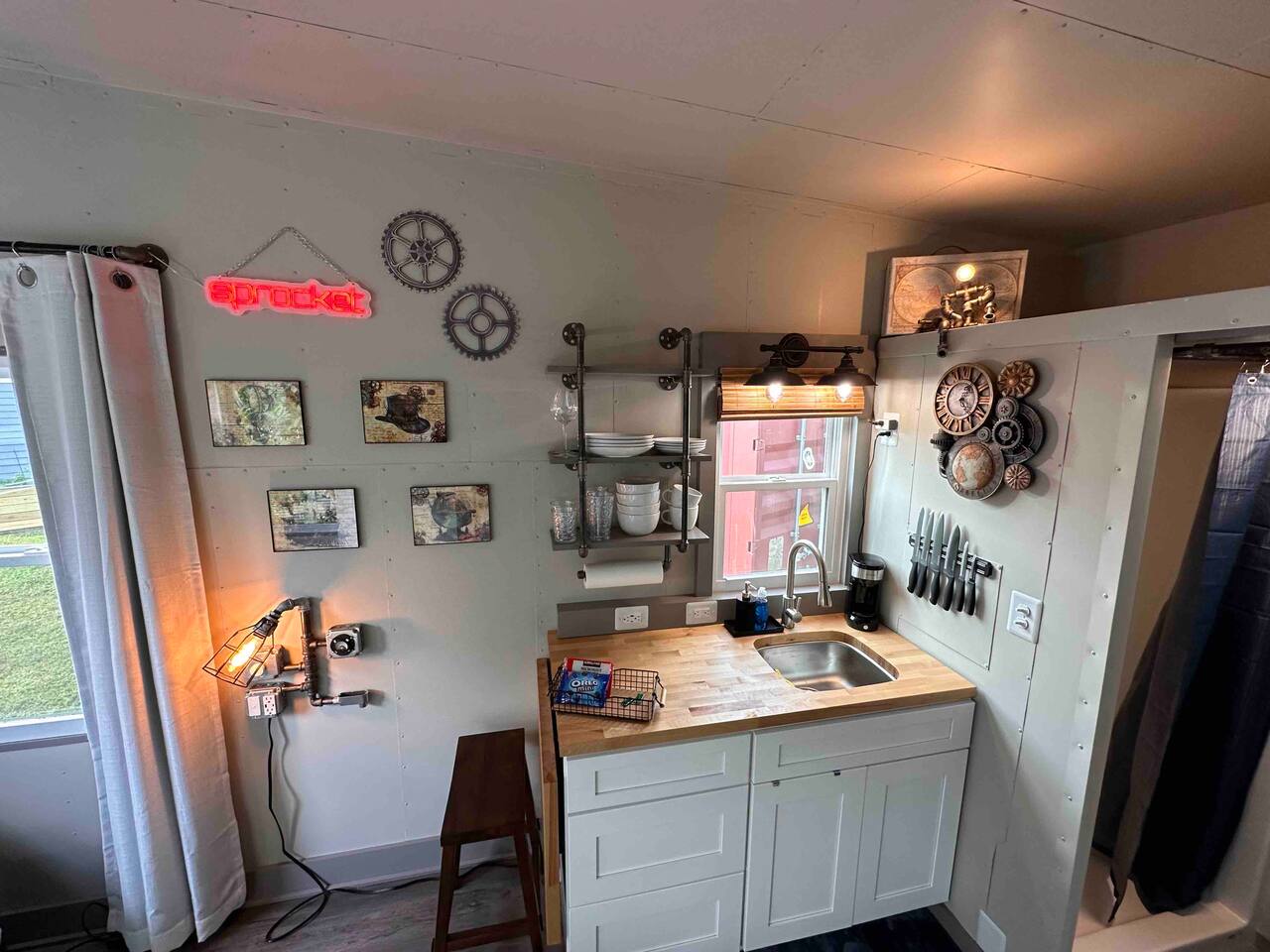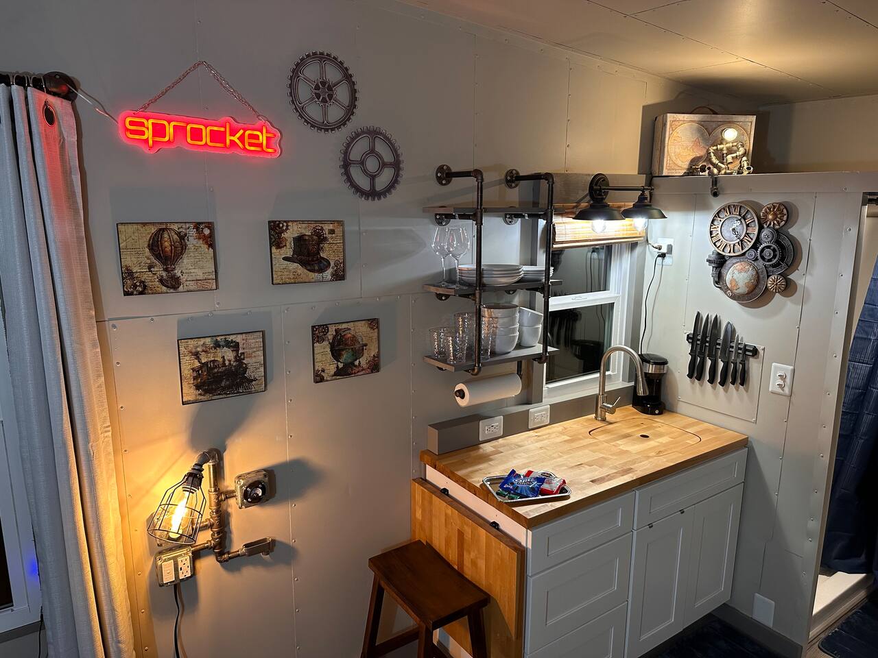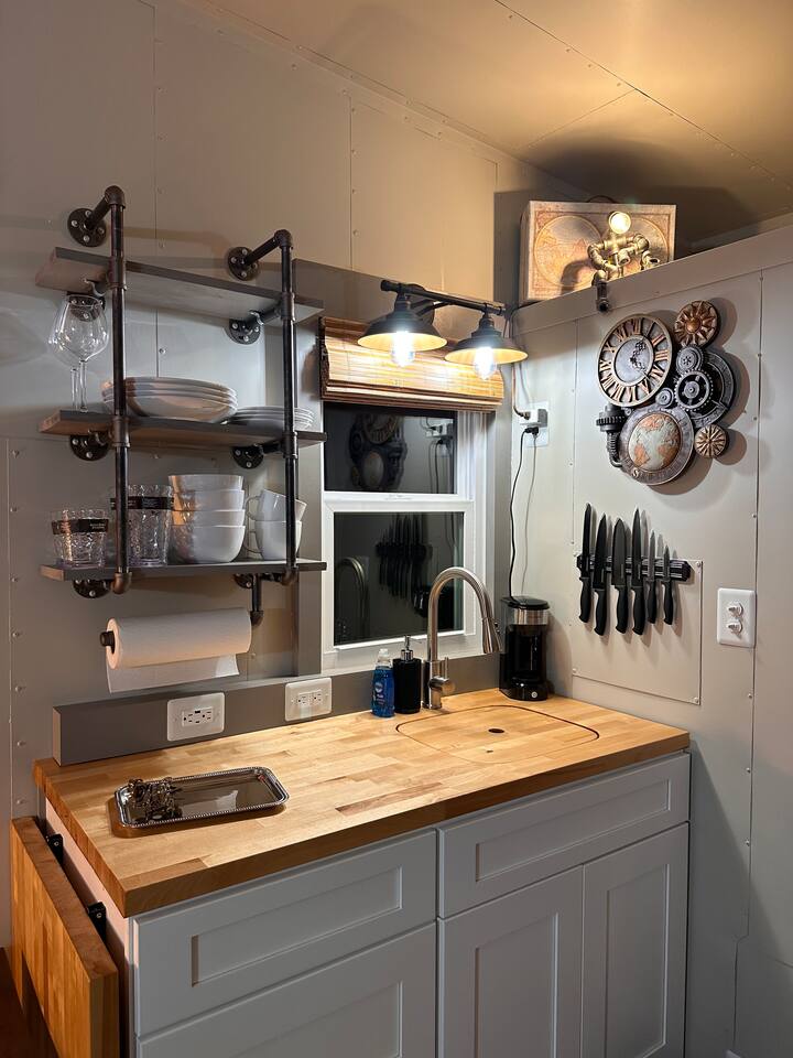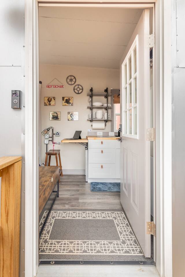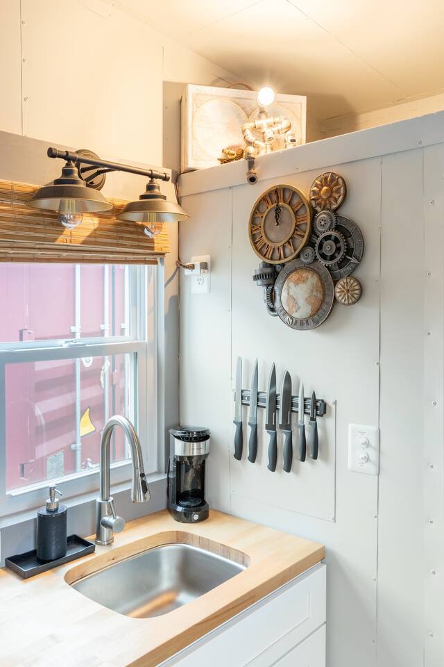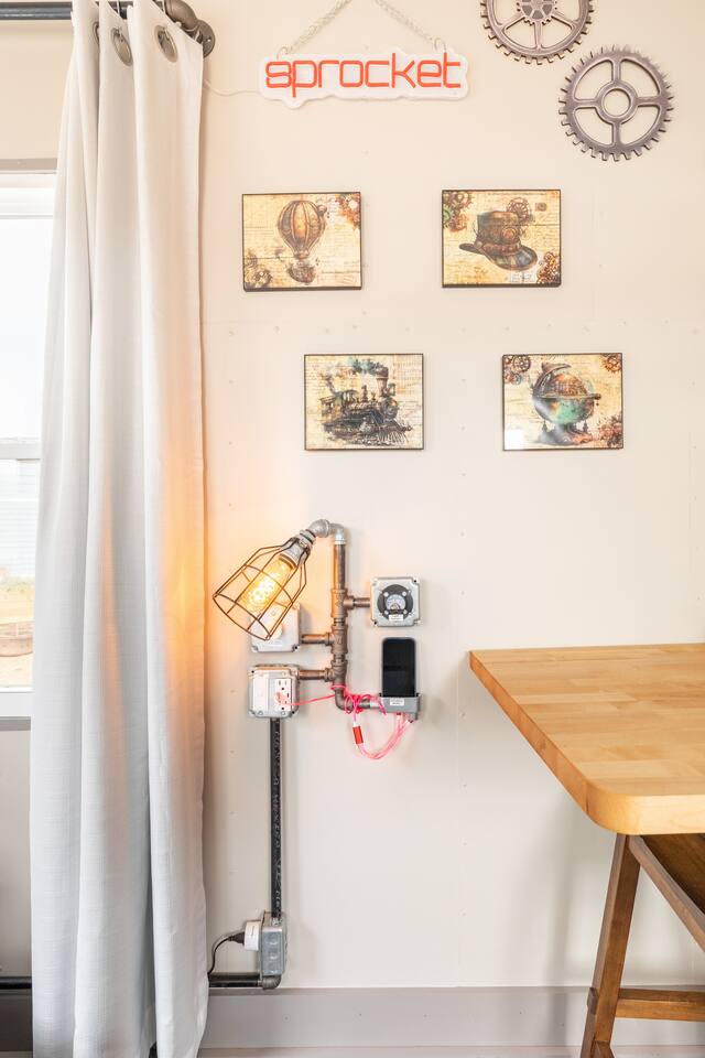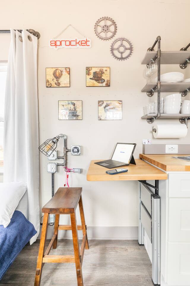 Looking for a Fun, UNIQUE stay?? This one-of-a-kind Steam-Punk themed “Off-Grid-Ready” tiny house on wheels features custom designed & built industrial light fixtures, shelving, and decoration & strategically functional devices to maximize the usability of this tiny house (even if there’s no land-based water, power or internet)! The “SPROCKET” comfortably sleeps 2 on an 8” queen memory foam mattress, complete with everything you need for a unique, enjoyable & DIFFERENT trip! >>> BOOK NOW! <<<