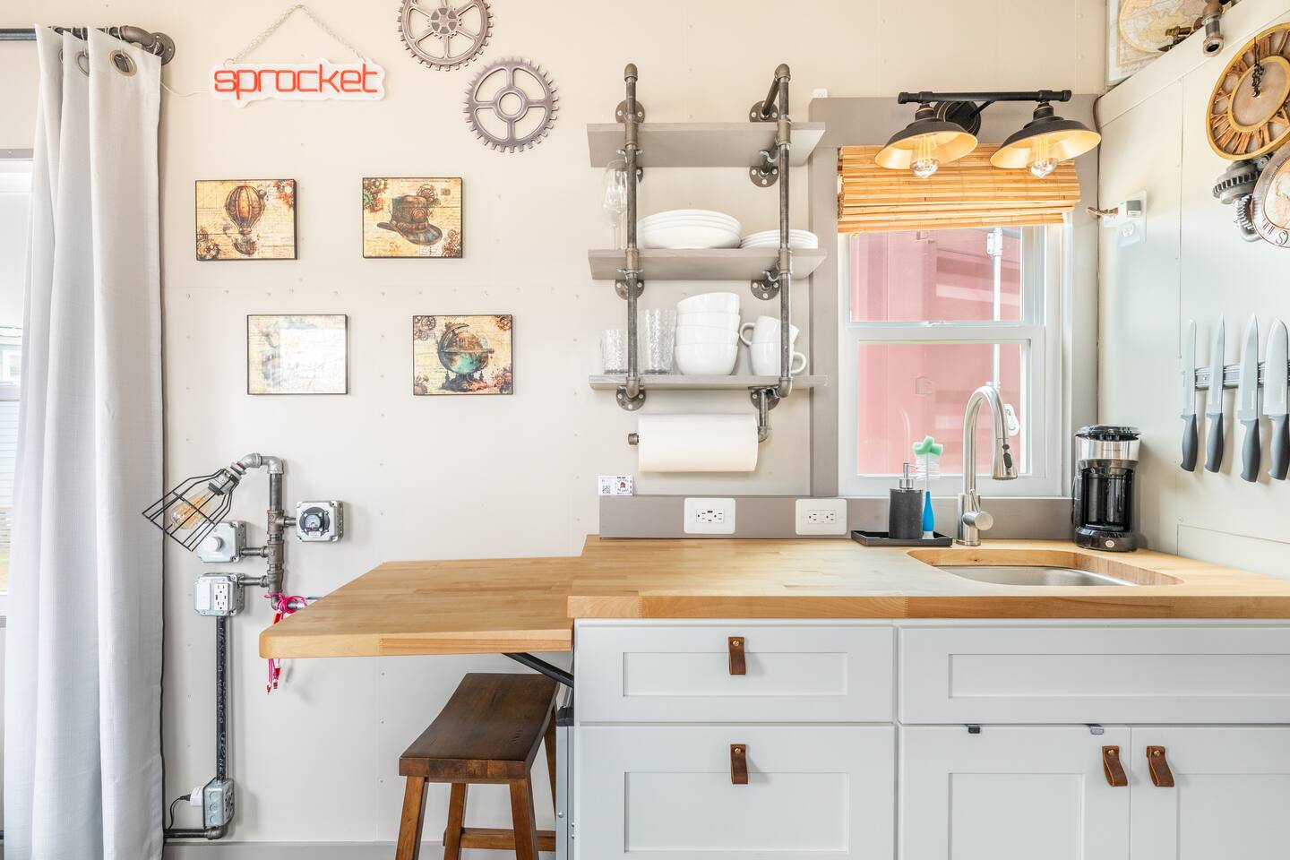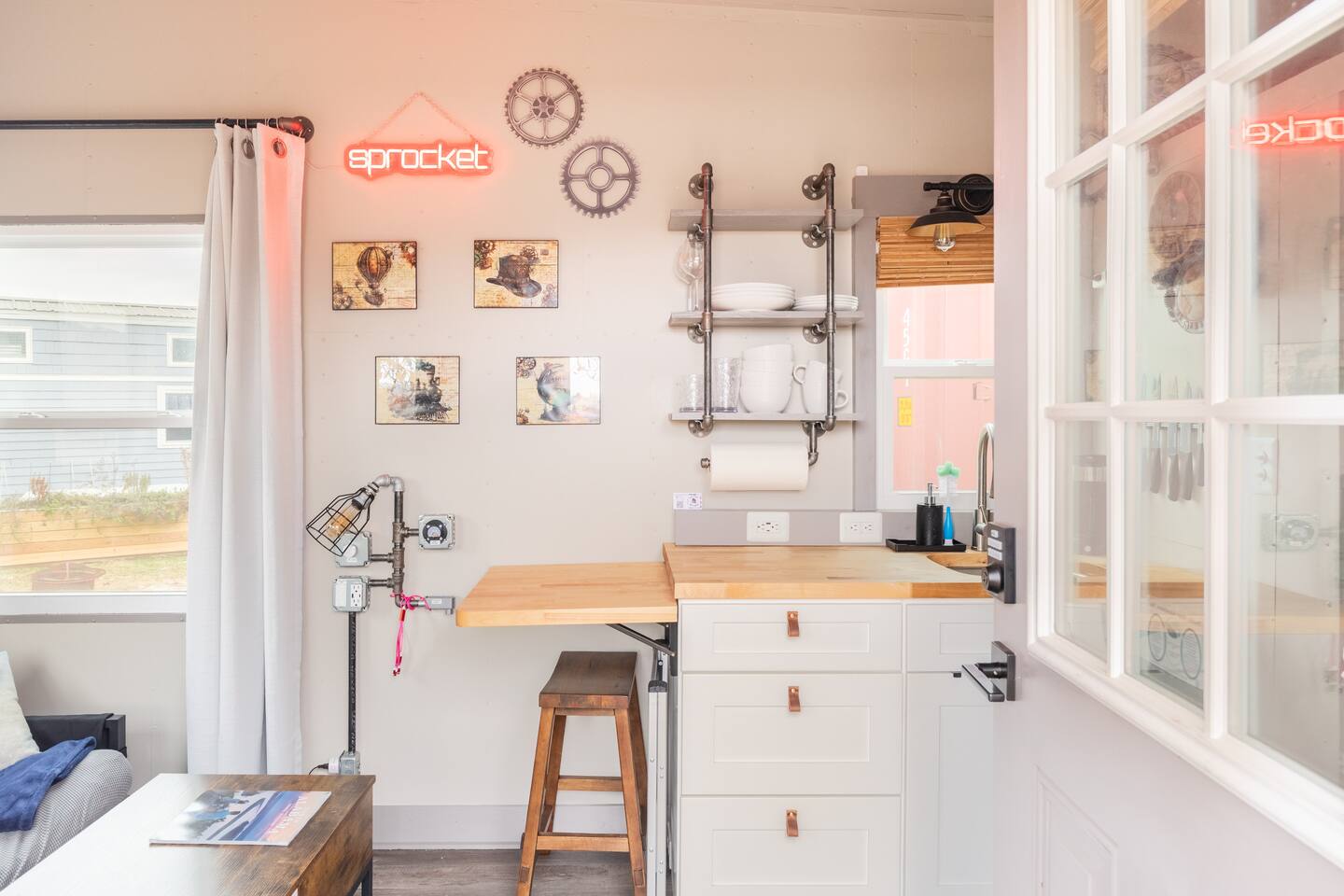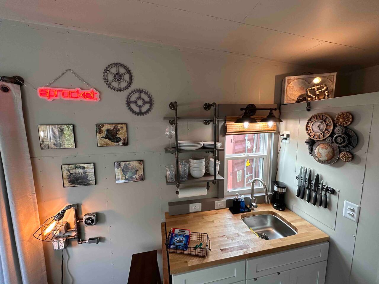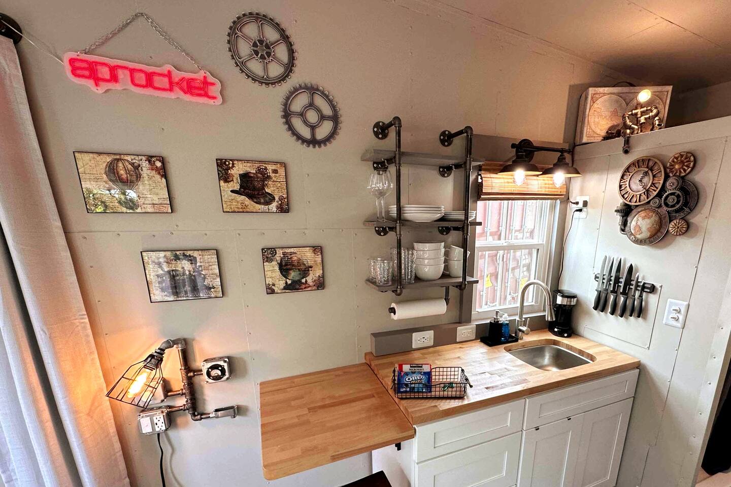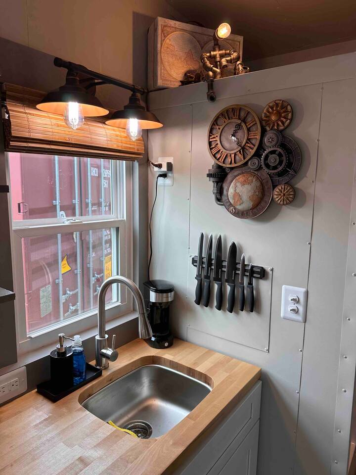 Looking for a Fun, UNIQUE stay?? This one-of-a-kind Steam-Punk themed “Off-Grid-Ready” tiny house on wheels features custom designed & built industrial light fixtures, shelving, and decoration & strategically functional devices to maximize the usability of this tiny house (even if there’s no land-based water, power or internet)! The “SPROCKET” comfortably sleeps 2 on an 8” queen memory foam mattress, complete with everything you need for a unique, enjoyable & DIFFERENT trip! >>> BOOK NOW! <<<