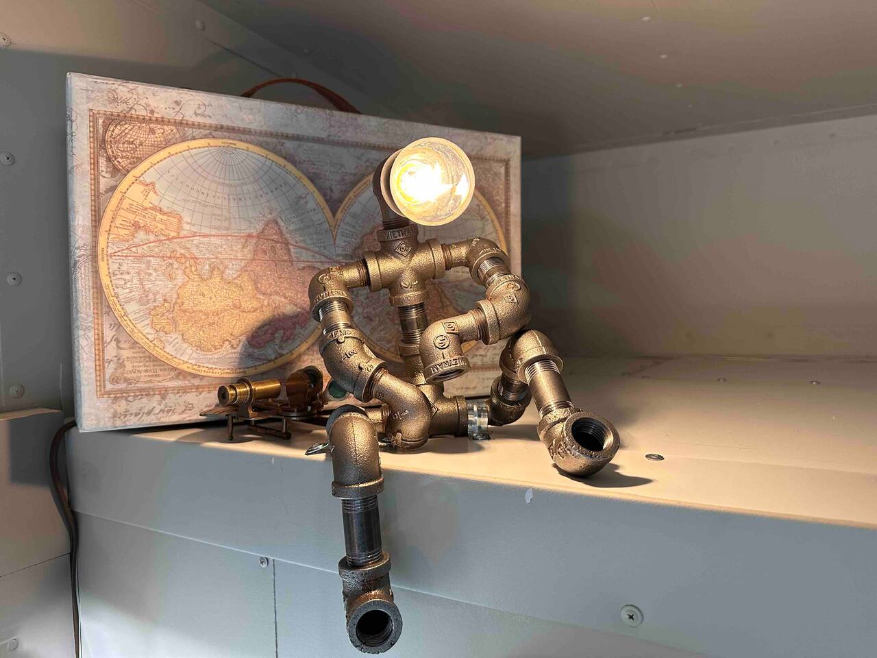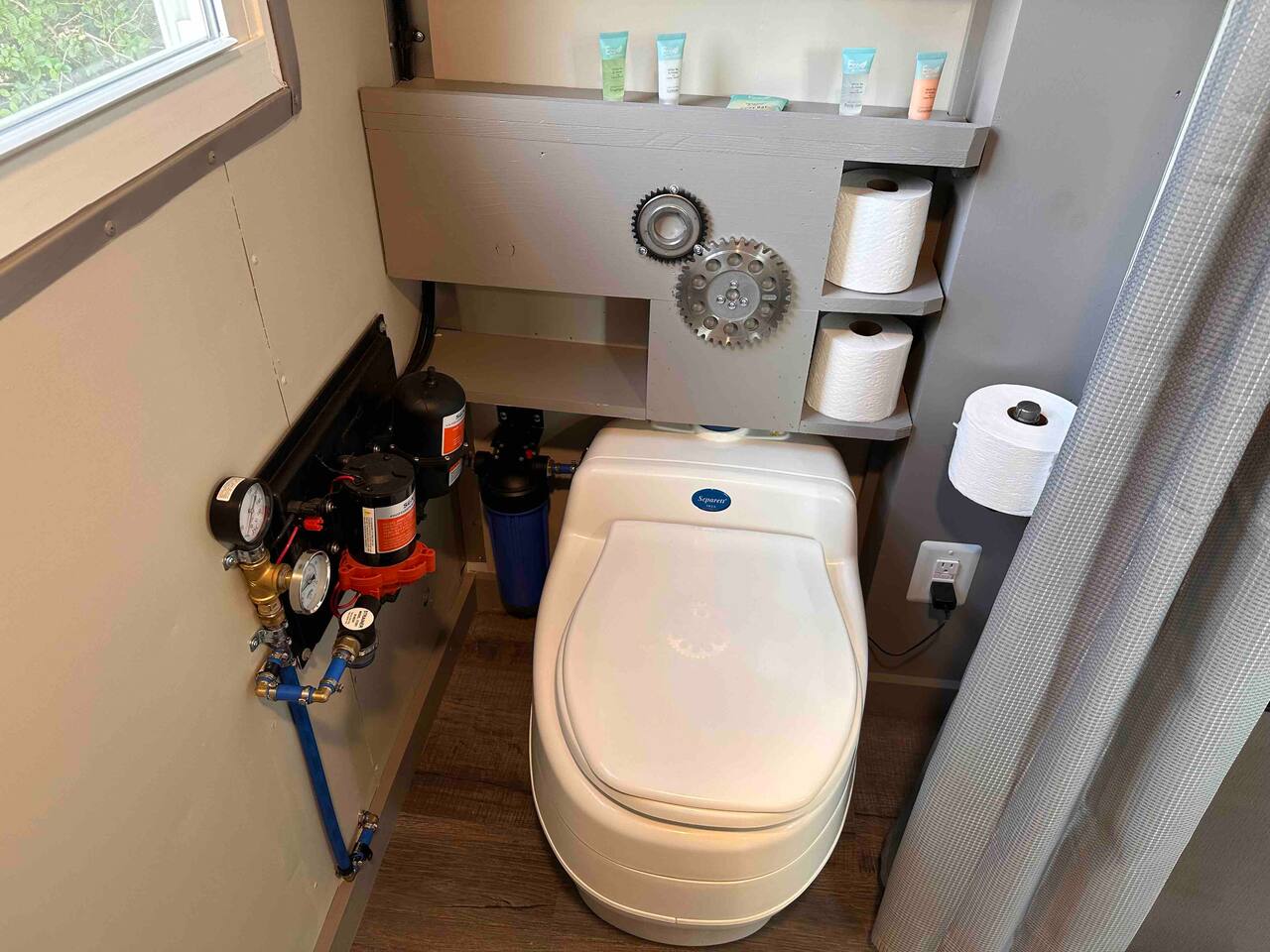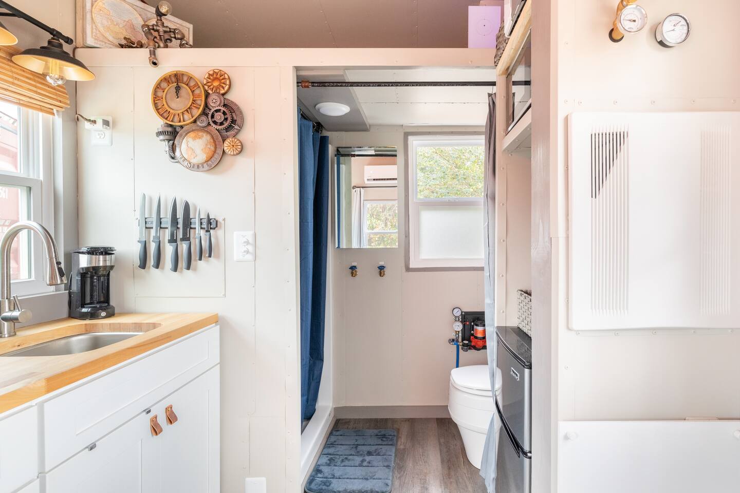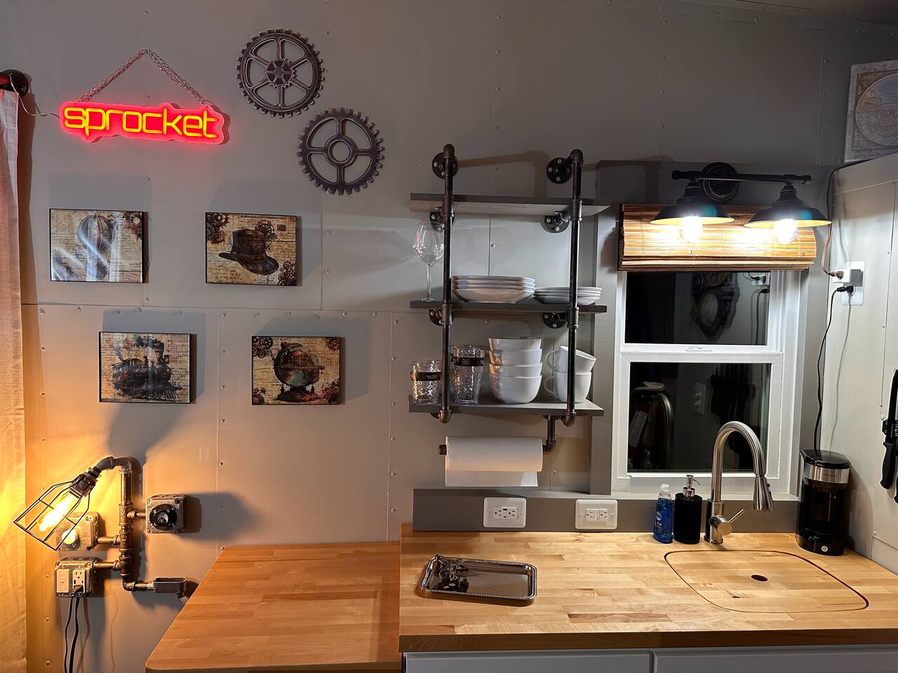 Looking for a Fun, UNIQUE stay?? This one-of-a-kind Steam-Punk themed “Off-Grid-Ready” tiny house on wheels features custom designed & built industrial light fixtures, shelving, and decoration & strategically functional devices to maximize the usability of this tiny house (even if there’s no land-based water, power or internet)! The “SPROCKET” comfortably sleeps 2 on an 8” queen memory foam mattress, complete with everything you need for a unique, enjoyable & DIFFERENT trip! >>> BOOK NOW! <<<