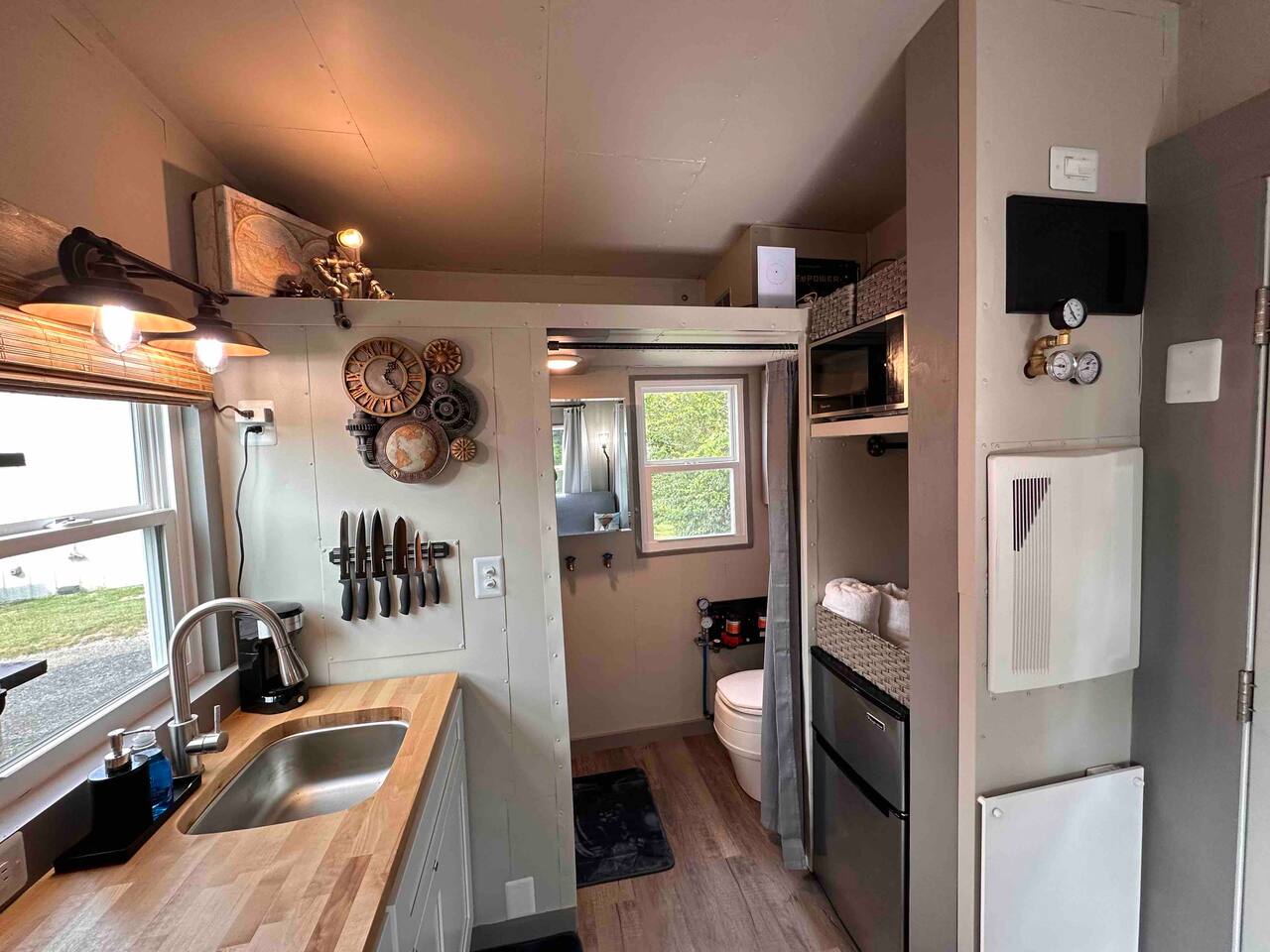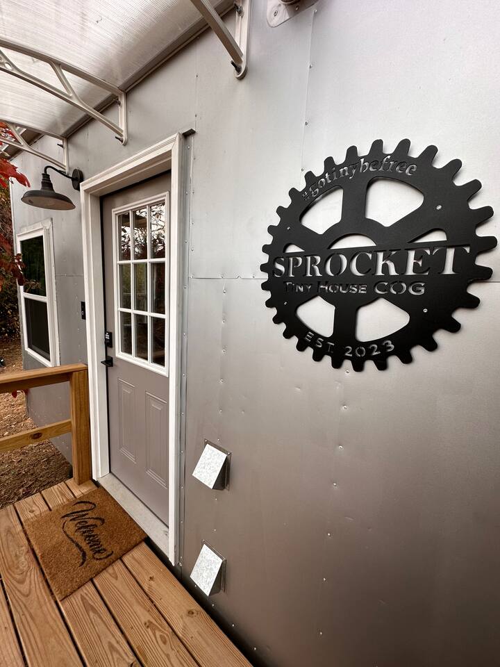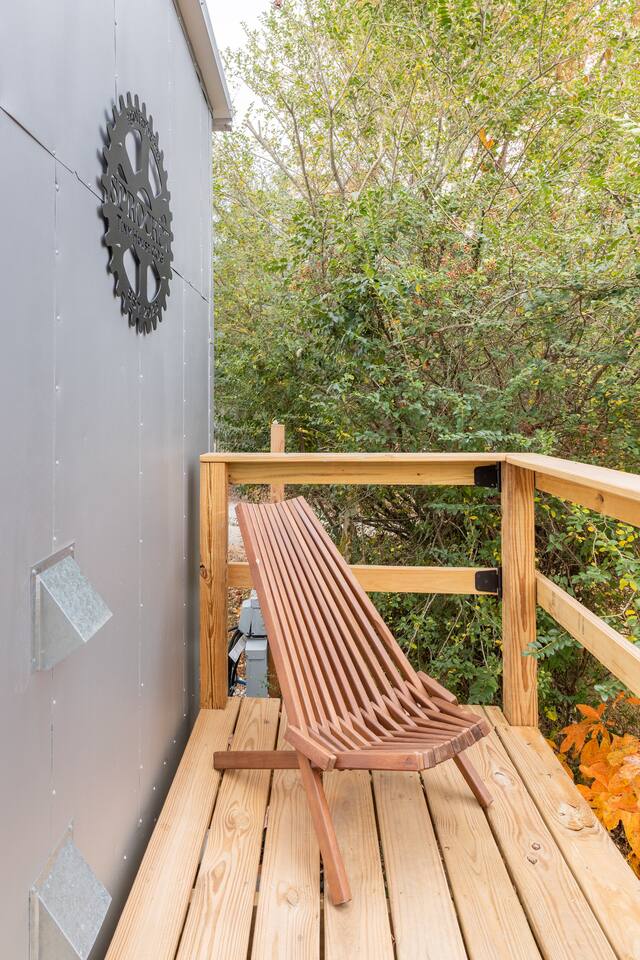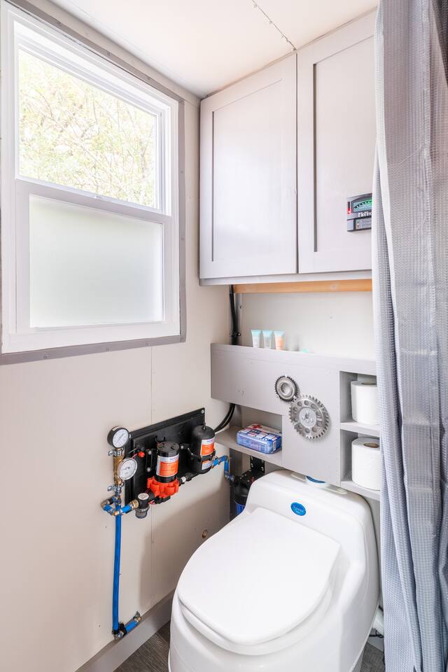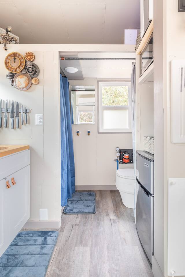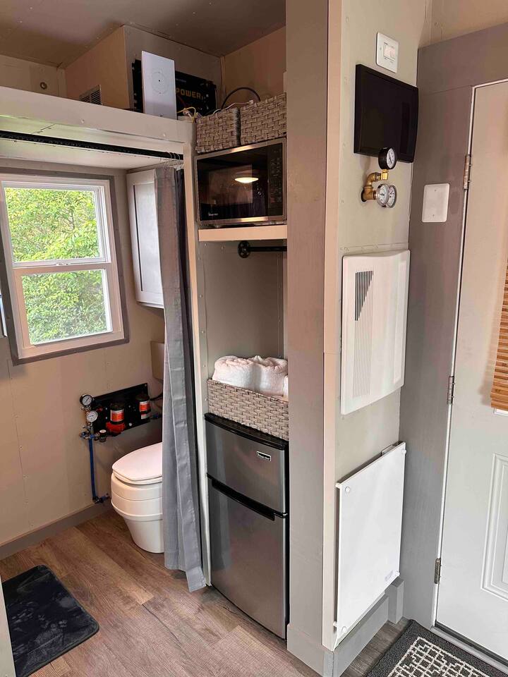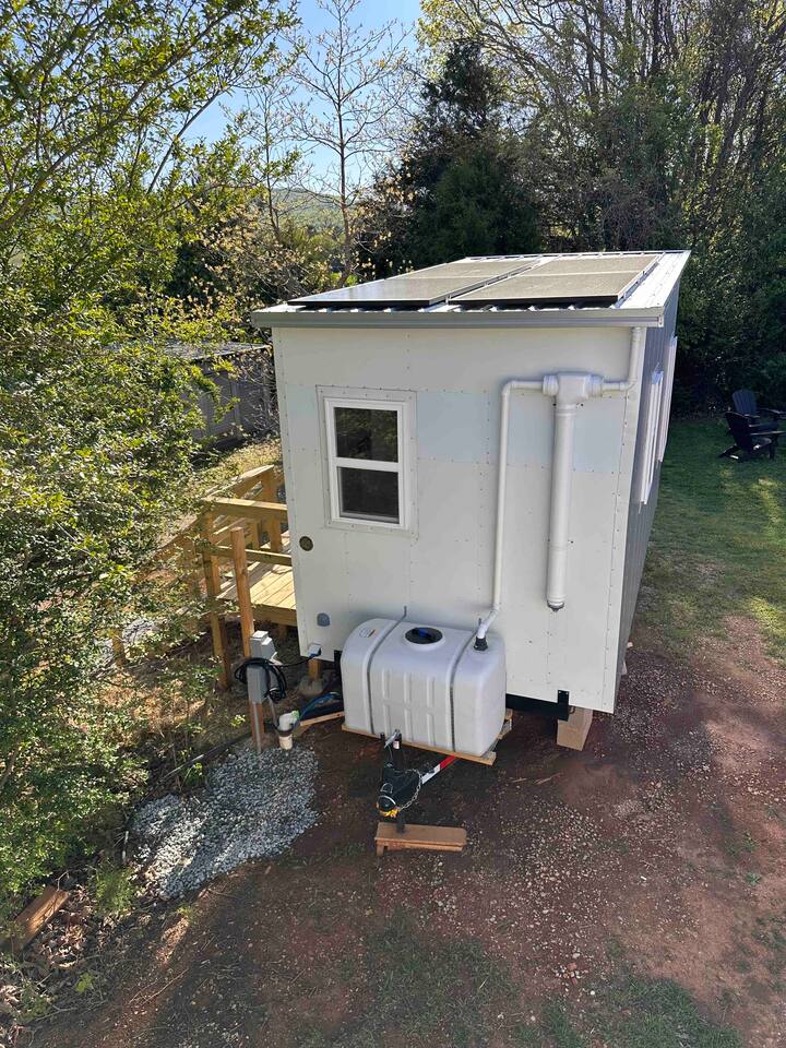 The Steam-Punk / Steel-Panel Rocket City (Huntsville) Tiny House, aka the “spRocket”, is a Custom Off-Grid (C.O.G.) tiny house on wheels (Get it? Sprocket? Cog? ;) with fully self-sustainable systems for water (rain catchment), power (solar + 10kw batteries) and internet (Starlink). But not to worry! The home is fully grid-connected in its current setup (water, power, sewer, WiFi), with the off-grid redundancy in place for you to experience and see how it works! Packing all that "form & function" in just an 8’x16’ footprint, it truly is something to behold and experience! Yet with 6 windows, a carefully-laid out floor plan, and neat creature comforts, it also comfortably sleeps 2 on a luxurious 8”-thick queen sofa bed to help give you an incredibly unique and memorable time! Some of the key industrial design features (see pics): **custom black pipe bed light with antique working analog voltage meter that fluctuates with light/dimmer knob control & holds your cell phone while it charges, complete with 2x 120v outlets plus USB-A & USB-C outlets **custom black pipe robot light piece sitting on loft **black pipe living room light, curtain/closet/shower rods, shelving, coat racks, towel hooks, toilet paper holder, paper towel holder, etc **analog functioning gauges all over to keep tabs on the aspects of this offgrid tiny home’s systems (water temp, pressure, gas pressure, voltage, etc) and some modern digital displays as well (thermostat, weather, battery State of Charge/voltage, etc)... The Off-Grid components include: ***4-panel roof-mounted solar array & battery backup system with onboard solar charge controller & 3000 watt inverter ***First-flush rain collection water system with inline filters & pumps +100 gallon fresh water storage ***Starlink satellite internet for WiFi (as well as high speed reliable 1GB fiber WiFi for guests with cellular backup) ***Waterless, flushless toilet (gray water system) with built-in exhaust fan ***Tankless on-demand propane water heater ***Removable induction stove top (with 2 compatible pots/pans) for fast, efficient cooking ***Smart electronics: deadbolt, lights, heat/cool, dehumidifer, CO/smoke detectors, etc The kitchenette with butcher block countertop & fold-down desk (and removable sink cover) & black pipe shelves has a kuerig/k-cup or grounds coffee maker, small microwave & fridge. The wall-mounted TV swivels for viewing from almost any spot in the home with all the streaming services (plus nearly 2,000 TV channels & video on demand) if you just want to sit back and relax or watch a series/movie/game... The mini split unit for heat & AC will keep the climate inside just how you want it, along with the ERV unit (energy recovery ventilator) which will bring in fresh but conditioned air from outside. A dehumidifier is in place as well to ensure the humidity is kept down to a comfortable level. A wall-mounted ceramic wall heater provides that warm gentle heat along with on-demand hot water. An 18” high storage loft above the bathroom is perfect for storing your bag or suitcase or any larger items (small step ladder provided for easier access to loft as well) while the coffee table top lifts up and turns into a couch desk with storage underneath The wide split-lifting top coffee table in front of the sofa bed is perfect for getting work done or playing games on your tablet, laptop or other table-top electronic device. Other notable features: **spacious 36” shower **butcher block countertop covers kitchen sink hole for more surface area **folding table/desk next to kitchen counter for more work or dining/kitchen surfaces or put it down for more space to move around in **comfortable wooden lounge chair on front deck to enjoy quiet mornings with a cup of joe or peaceful evenings with a cocktail **awning over front door to keep you dry and/or block some of the sun when entering/exiting the home And so much more! You gotta book a stay to experience it! >>> Book now! <<<