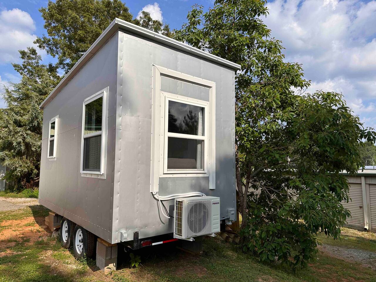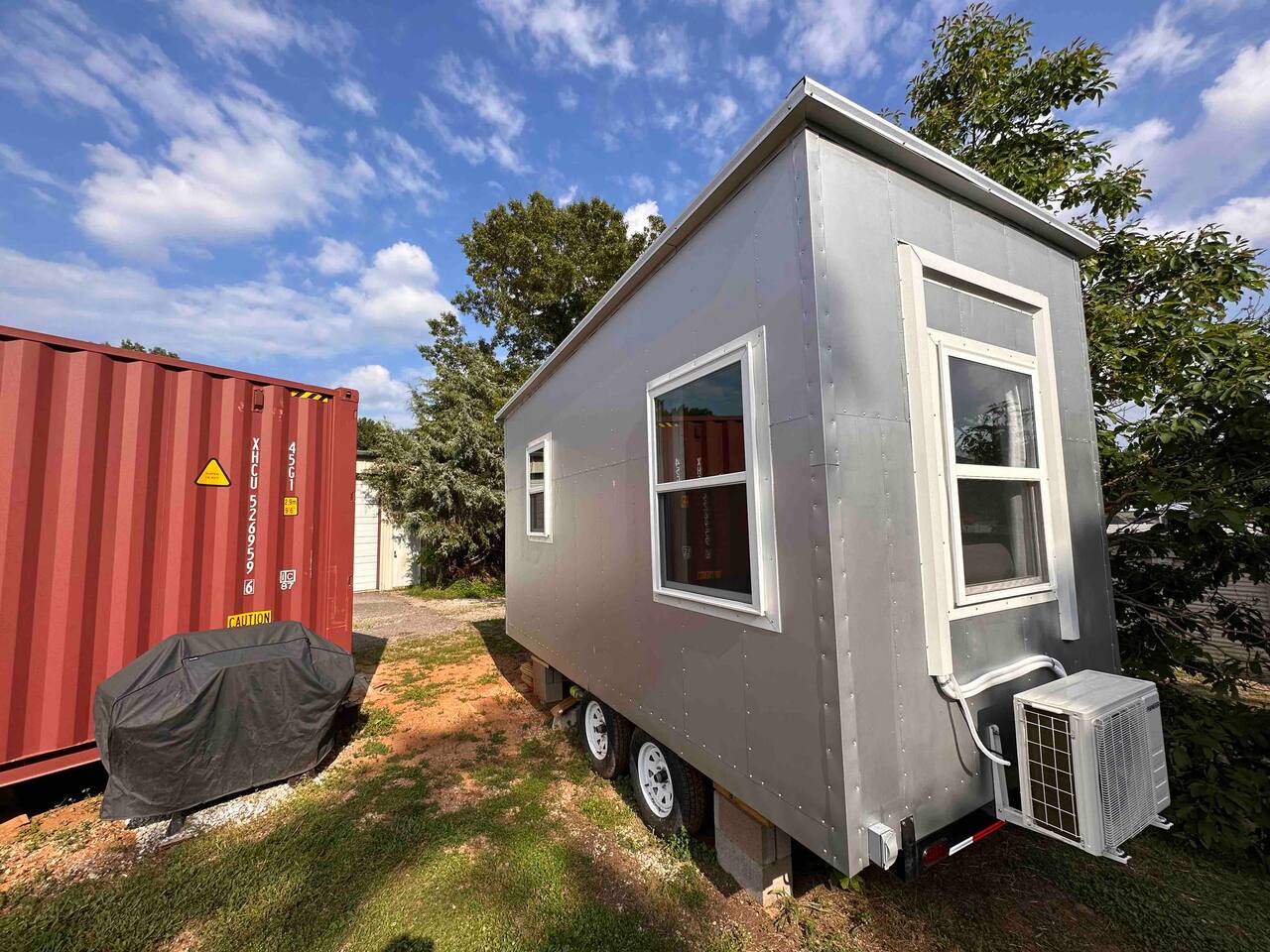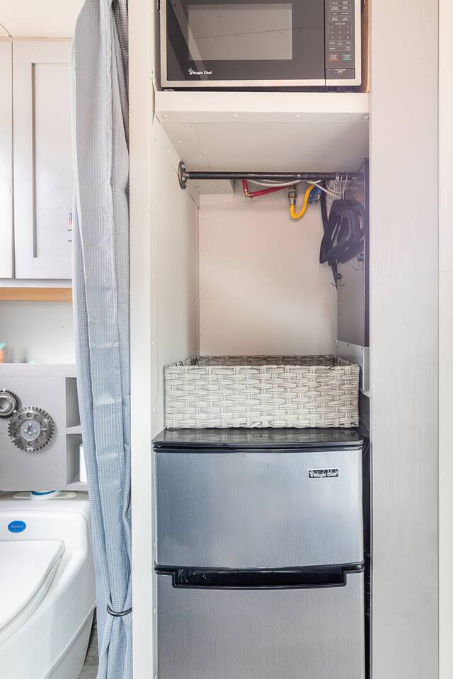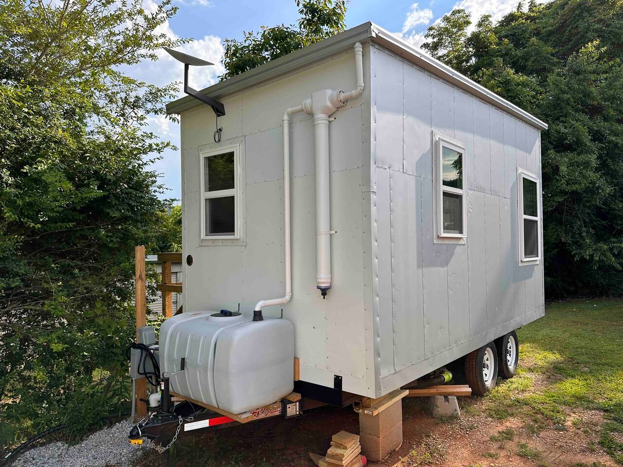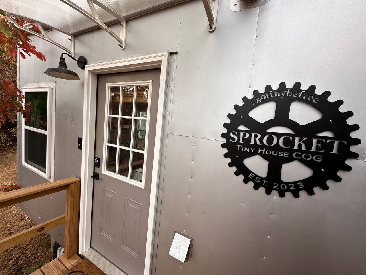 The Steam-Punk / Steel-Panel Rocket City (Huntsville) Tiny House, aka the “spRocket”, is a Custom Off-Grid (C.O.G.) tiny house on wheels (Get it? Sprocket? Cog? ;) with fully self-sustainable systems for water (rain catchment), power (solar + 10kw batteries) and internet (Starlink). But not to worry! The home is fully grid-connected in its current setup (water, power, sewer, WiFi), with the off-grid redundancy in place for you to experience and see how it works! Packing all that "form & function" in just an 8’x16’ footprint, it truly is something to behold and experience! Yet with 6 windows, a carefully-laid out floor plan, and neat creature comforts, it also comfortably sleeps 2 on a luxurious 8”-thick queen sofa bed to help give you an incredibly unique and memorable time! Some of the key industrial design features (see pics): **custom black pipe bed light with antique working analog voltage meter that fluctuates with light/dimmer knob control & holds your cell phone while it charges, complete with 2x 120v outlets plus USB-A & USB-C outlets **custom black pipe robot light piece sitting on loft **black pipe living room light, curtain/closet/shower rods, shelving, coat racks, towel hooks, toilet paper holder, paper towel holder, etc **analog functioning gauges all over to keep tabs on the aspects of this offgrid tiny home’s systems (water temp, pressure, gas pressure, voltage, etc) and some modern digital displays as well (thermostat, weather, battery State of Charge/voltage, etc)... The Off-Grid components include: ***4-panel roof-mounted solar array & battery backup system with onboard solar charge controller & 3000 watt inverter ***First-flush rain collection water system with inline filters & pumps +100 gallon fresh water storage ***Starlink satellite internet for WiFi (as well as high speed reliable 1GB fiber WiFi for guests with cellular backup) ***Waterless, flushless toilet (gray water system) with built-in exhaust fan ***Tankless on-demand propane water heater ***Removable induction stove top (with 2 compatible pots/pans) for fast, efficient cooking ***Smart electronics: deadbolt, lights, heat/cool, dehumidifer, CO/smoke detectors, etc The kitchenette with butcher block countertop & fold-down desk (and removable sink cover) & black pipe shelves has a kuerig/k-cup or grounds coffee maker, small microwave & fridge. The wall-mounted TV swivels for viewing from almost any spot in the home with all the streaming services (plus nearly 2,000 TV channels & video on demand) if you just want to sit back and relax or watch a series/movie/game... The mini split unit for heat & AC will keep the climate inside just how you want it, along with the ERV unit (energy recovery ventilator) which will bring in fresh but conditioned air from outside. A dehumidifier is in place as well to ensure the humidity is kept down to a comfortable level. A wall-mounted ceramic wall heater provides that warm gentle heat along with on-demand hot water. An 18” high storage loft above the bathroom is perfect for storing your bag or suitcase or any larger items (small step ladder provided for easier access to loft as well) while the coffee table top lifts up and turns into a couch desk with storage underneath The wide split-lifting top coffee table in front of the sofa bed is perfect for getting work done or playing games on your tablet, laptop or other table-top electronic device. Other notable features: **spacious 36” shower **butcher block countertop covers kitchen sink hole for more surface area **folding table/desk next to kitchen counter for more work or dining/kitchen surfaces or put it down for more space to move around in **comfortable wooden lounge chair on front deck to enjoy quiet mornings with a cup of joe or peaceful evenings with a cocktail **awning over front door to keep you dry and/or block some of the sun when entering/exiting the home And so much more! You gotta book a stay to experience it! >>> Book now! <<<