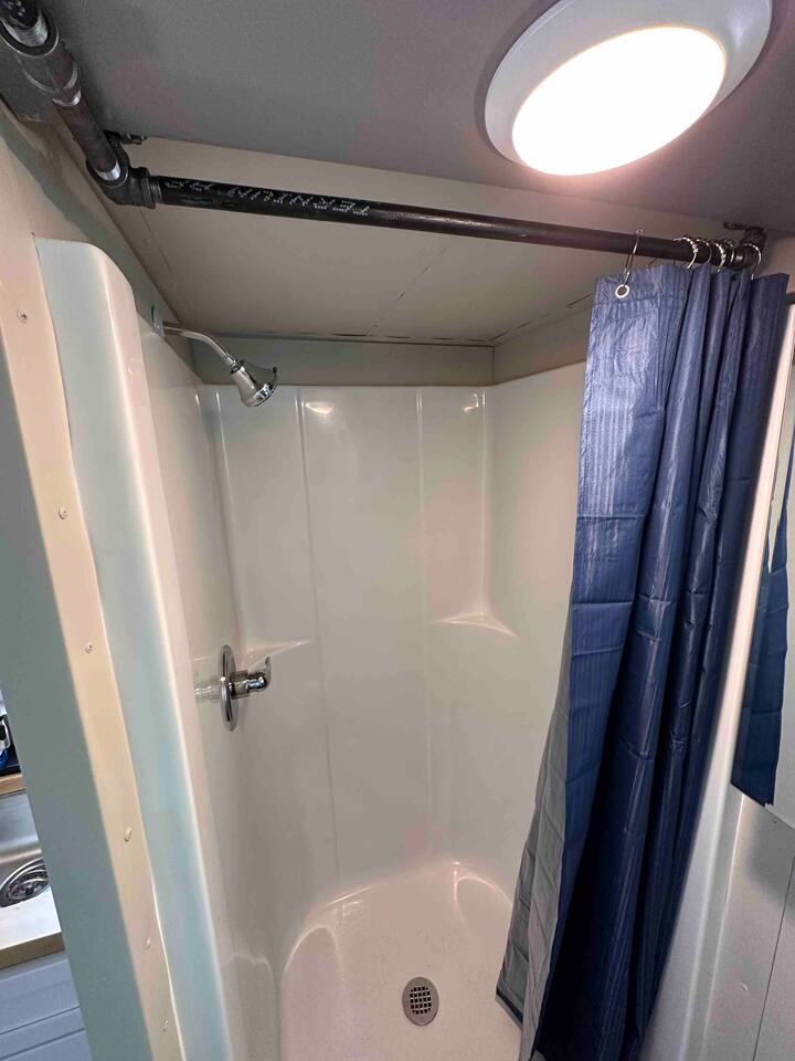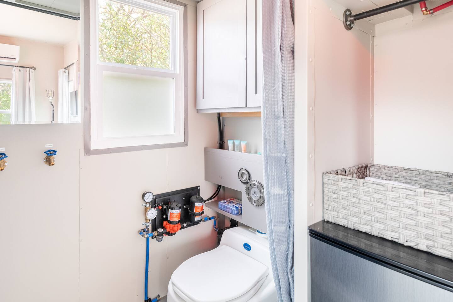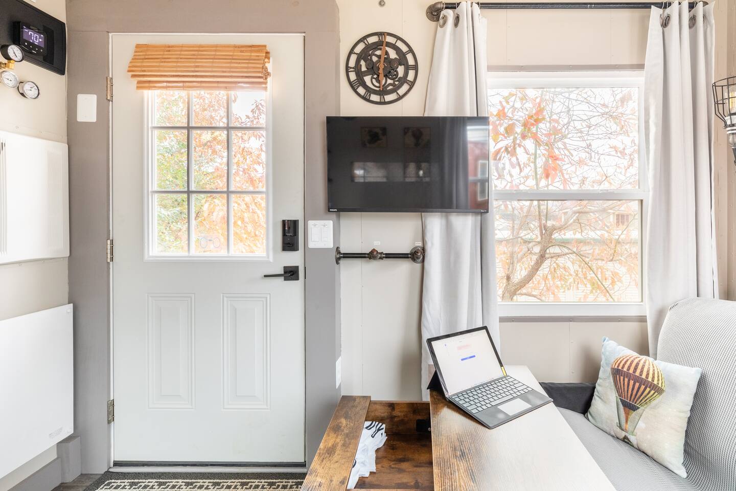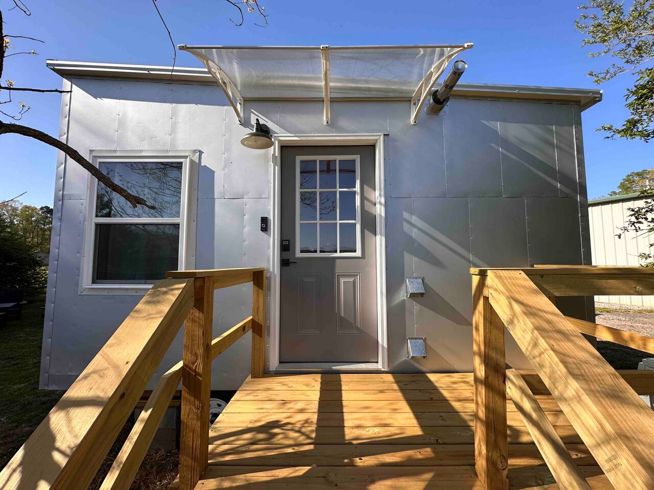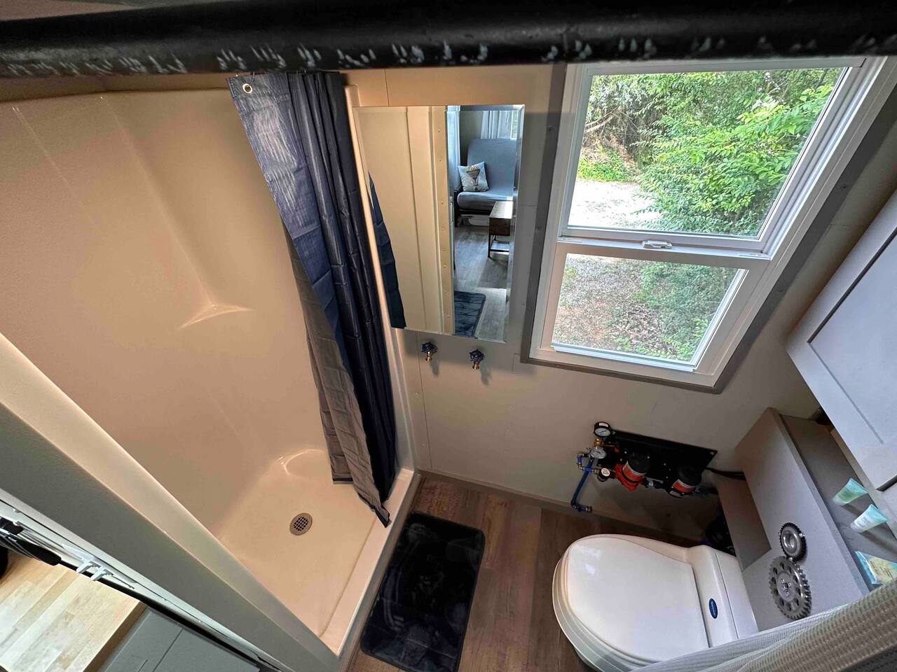 The Steam-Punk / Steel-Panel Rocket City (Huntsville) Tiny House, aka the “spRocket”, is a Custom Off-Grid (C.O.G.) tiny house on wheels (Get it? Sprocket? Cog? ;) with fully self-sustainable systems for water (rain catchment), power (solar + 10kw batteries) and internet (Starlink). But not to worry! The home is fully grid-connected in its current setup (water, power, sewer, WiFi), with the off-grid redundancy in place for you to experience and see how it works! Packing all that "form & function" in just an 8’x16’ footprint, it truly is something to behold and experience! Yet with 6 windows, a carefully-laid out floor plan, and neat creature comforts, it also comfortably sleeps 2 on a luxurious 8”-thick queen sofa bed to help give you an incredibly unique and memorable time! Some of the key industrial design features (see pics): **custom black pipe bed light with antique working analog voltage meter that fluctuates with light/dimmer knob control & holds your cell phone while it charges, complete with 2x 120v outlets plus USB-A & USB-C outlets **custom black pipe robot light piece sitting on loft **black pipe living room light, curtain/closet/shower rods, shelving, coat racks, towel hooks, toilet paper holder, paper towel holder, etc **analog functioning gauges all over to keep tabs on the aspects of this offgrid tiny home’s systems (water temp, pressure, gas pressure, voltage, etc) and some modern digital displays as well (thermostat, weather, battery State of Charge/voltage, etc)... The Off-Grid components include: ***4-panel roof-mounted solar array & battery backup system with onboard solar charge controller & 3000 watt inverter ***First-flush rain collection water system with inline filters & pumps +100 gallon fresh water storage ***Starlink satellite internet for WiFi (as well as high speed reliable 1GB fiber WiFi for guests with cellular backup) ***Waterless, flushless toilet (gray water system) with built-in exhaust fan ***Tankless on-demand propane water heater ***Removable induction stove top (with 2 compatible pots/pans) for fast, efficient cooking ***Smart electronics: deadbolt, lights, heat/cool, dehumidifer, CO/smoke detectors, etc The kitchenette with butcher block countertop & fold-down desk (and removable sink cover) & black pipe shelves has a kuerig/k-cup or grounds coffee maker, small microwave & fridge. The wall-mounted TV swivels for viewing from almost any spot in the home with all the streaming services (plus nearly 2,000 TV channels & video on demand) if you just want to sit back and relax or watch a series/movie/game... The mini split unit for heat & AC will keep the climate inside just how you want it, along with the ERV unit (energy recovery ventilator) which will bring in fresh but conditioned air from outside. A dehumidifier is in place as well to ensure the humidity is kept down to a comfortable level. A wall-mounted ceramic wall heater provides that warm gentle heat along with on-demand hot water. An 18” high storage loft above the bathroom is perfect for storing your bag or suitcase or any larger items (small step ladder provided for easier access to loft as well) while the coffee table top lifts up and turns into a couch desk with storage underneath The wide split-lifting top coffee table in front of the sofa bed is perfect for getting work done or playing games on your tablet, laptop or other table-top electronic device. Other notable features: **spacious 36” shower **butcher block countertop covers kitchen sink hole for more surface area **folding table/desk next to kitchen counter for more work or dining/kitchen surfaces or put it down for more space to move around in **comfortable wooden lounge chair on front deck to enjoy quiet mornings with a cup of joe or peaceful evenings with a cocktail **awning over front door to keep you dry and/or block some of the sun when entering/exiting the home And so much more! You gotta book a stay to experience it! >>> Book now! <<<
